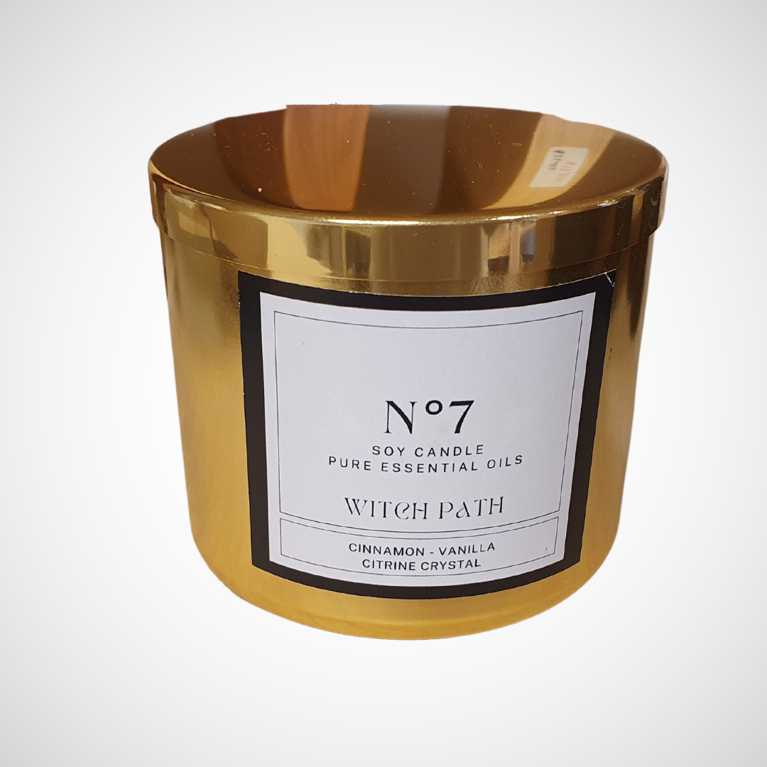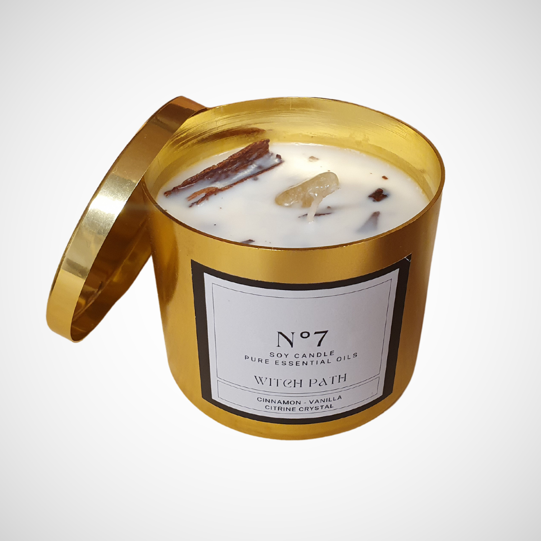 Vela artesanal de cera de soja con pabilo común, perfumada con aceites esenciales de canela y vainilla, decorada con canela y piedra citrino (Una vez que se termina la vela puedes guardar la piedra como amuleto).