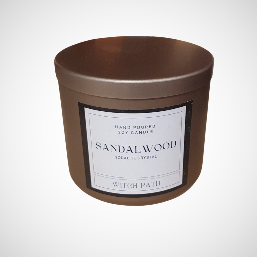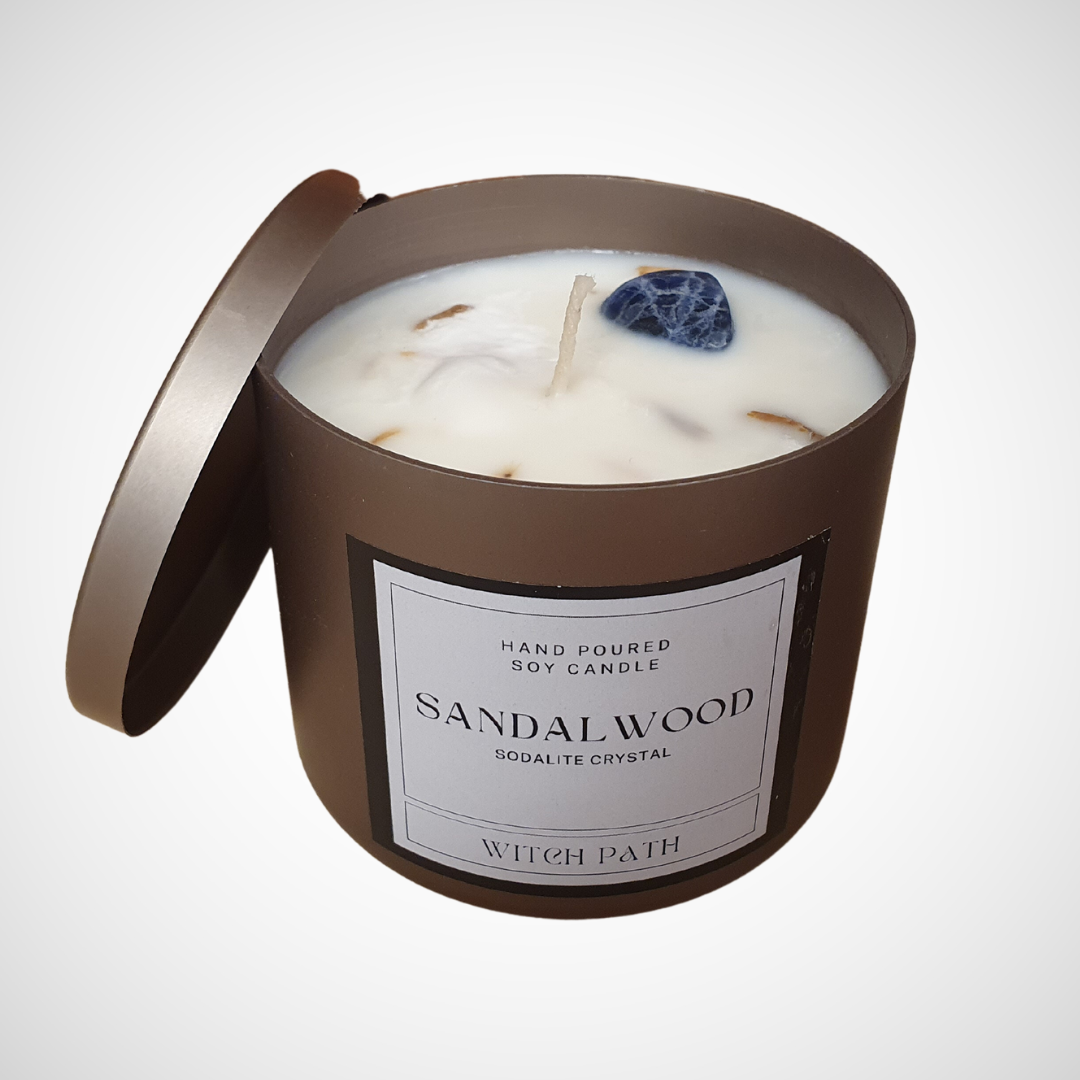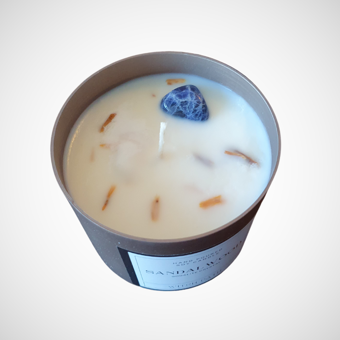 Vela artesanal de cera de soja con pabilo común, perfumada con aceites esenciales de sándalo, decorada con palo santo y piedra sodalita (Una vez que se termina la vela puedes guardar la piedra como amuleto).