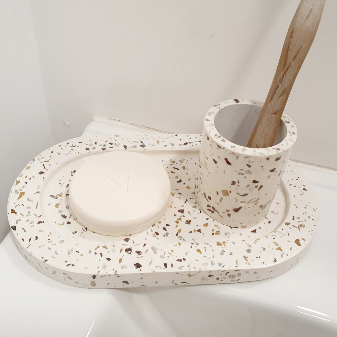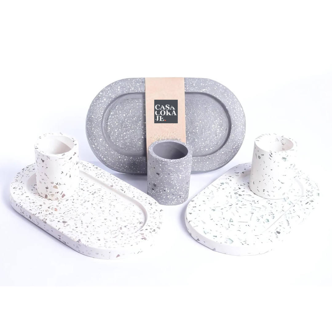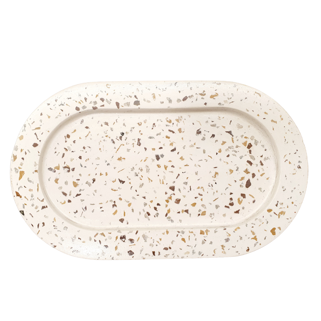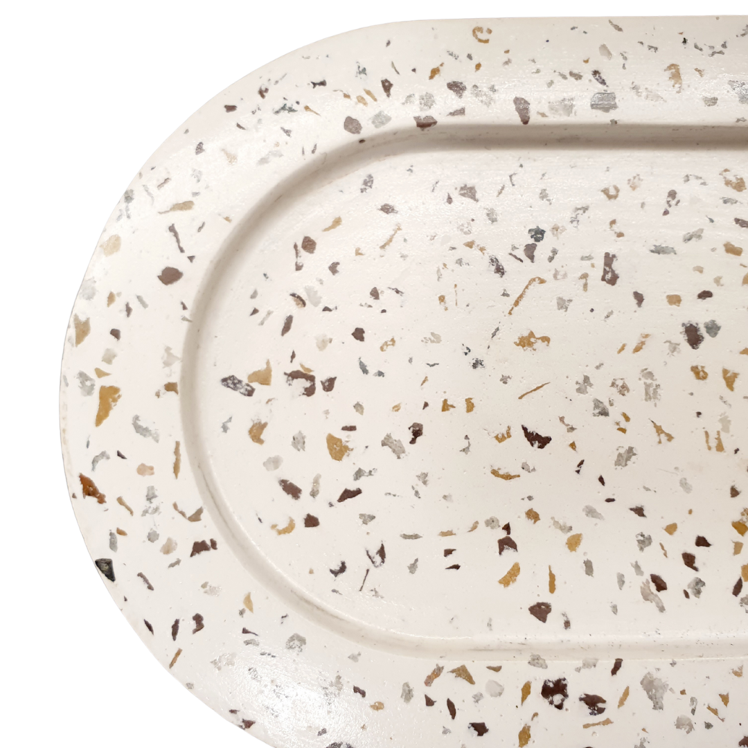 Divina, novedosa y versátil, esta Bandeja de Terrazo/cemento se puede usar desde el bar y servir aperitivos con amigos hasta el baño y lucirla con velas y perfumes.