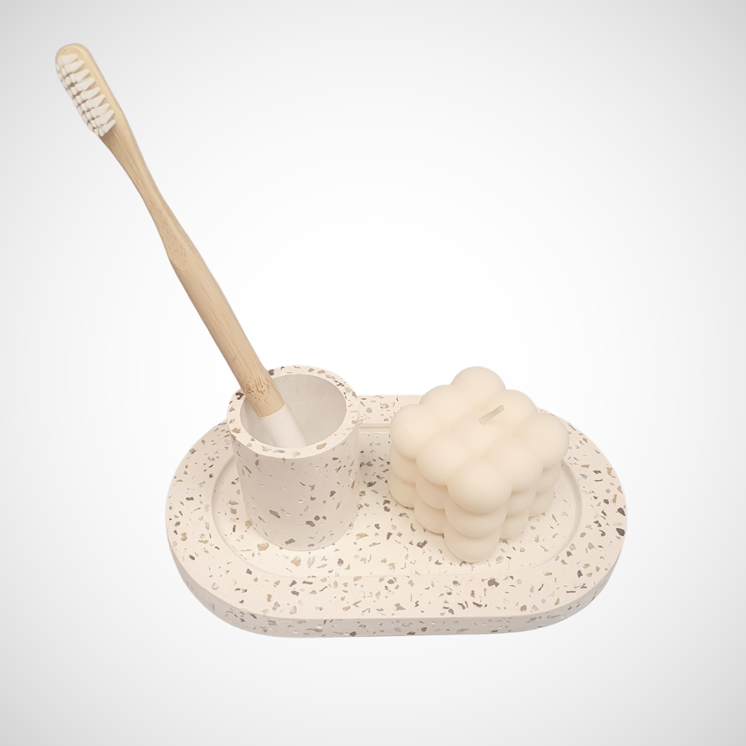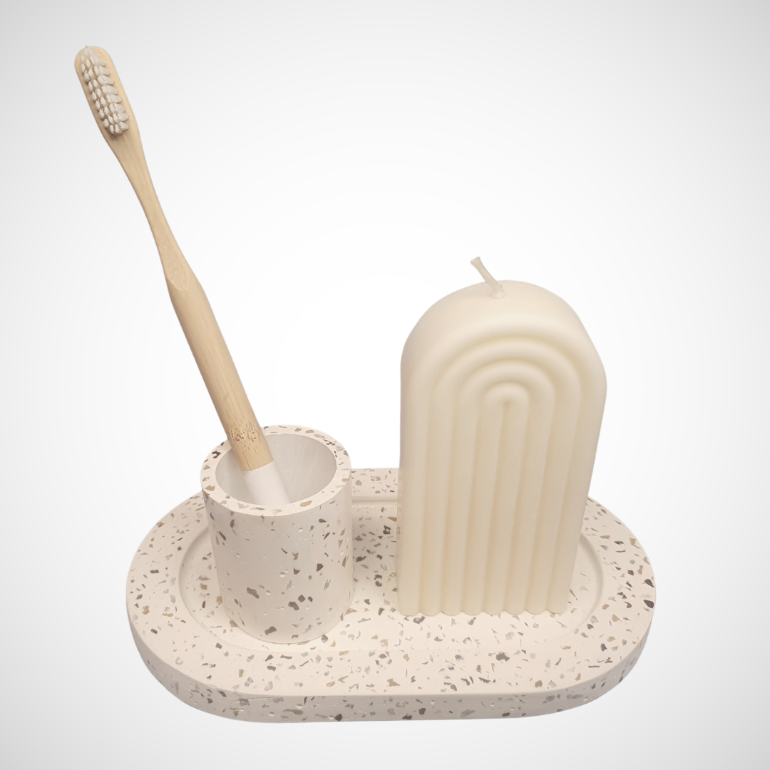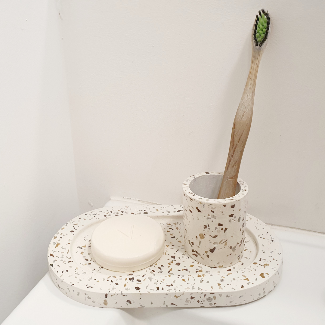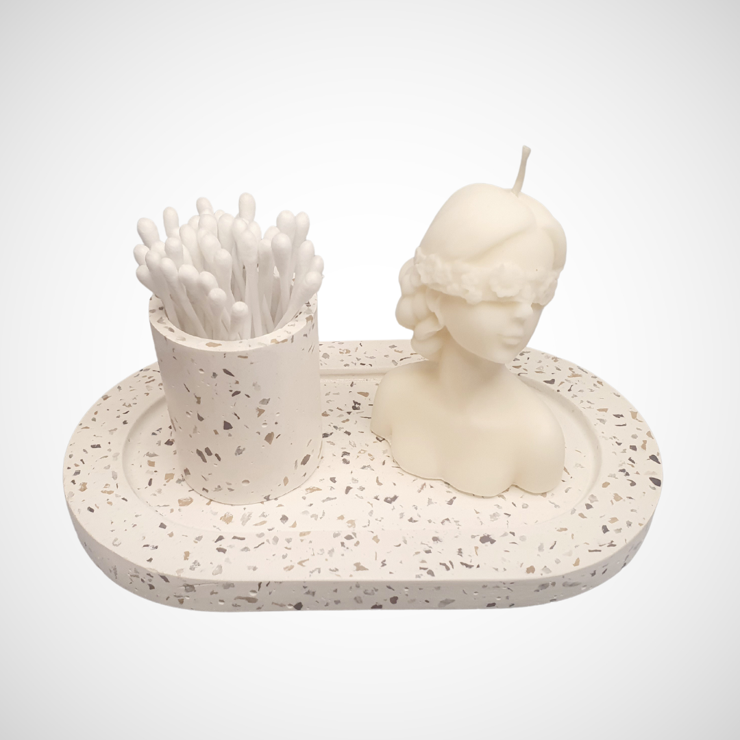 Divina, novedosa y versátil, esta Bandeja de Terrazo/cemento se puede usar desde el bar y servir aperitivos con amigos hasta el baño y lucirla con velas y perfumes.