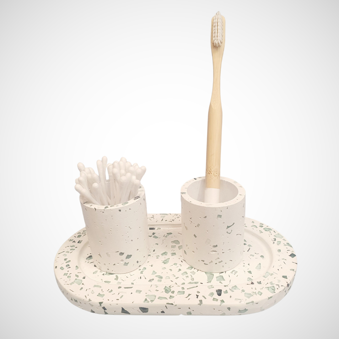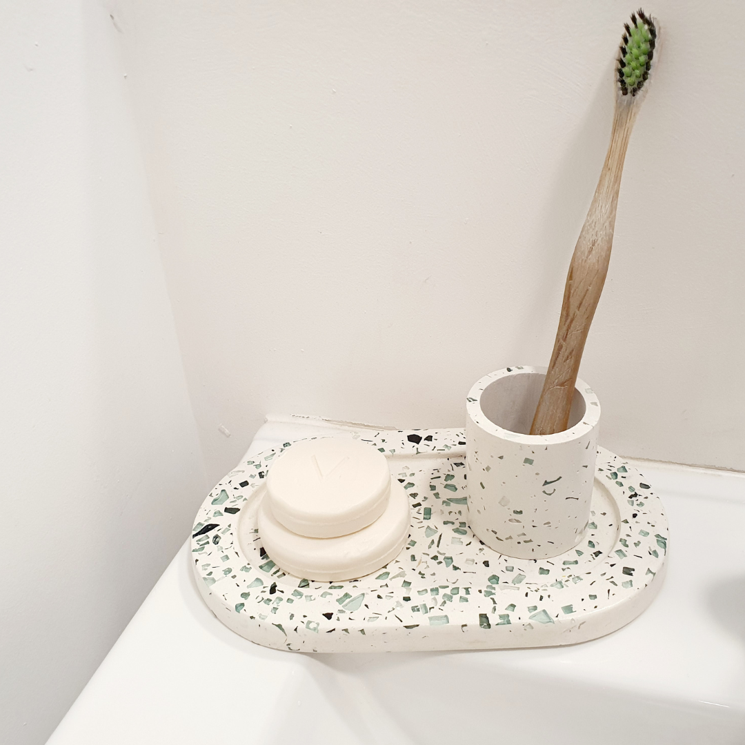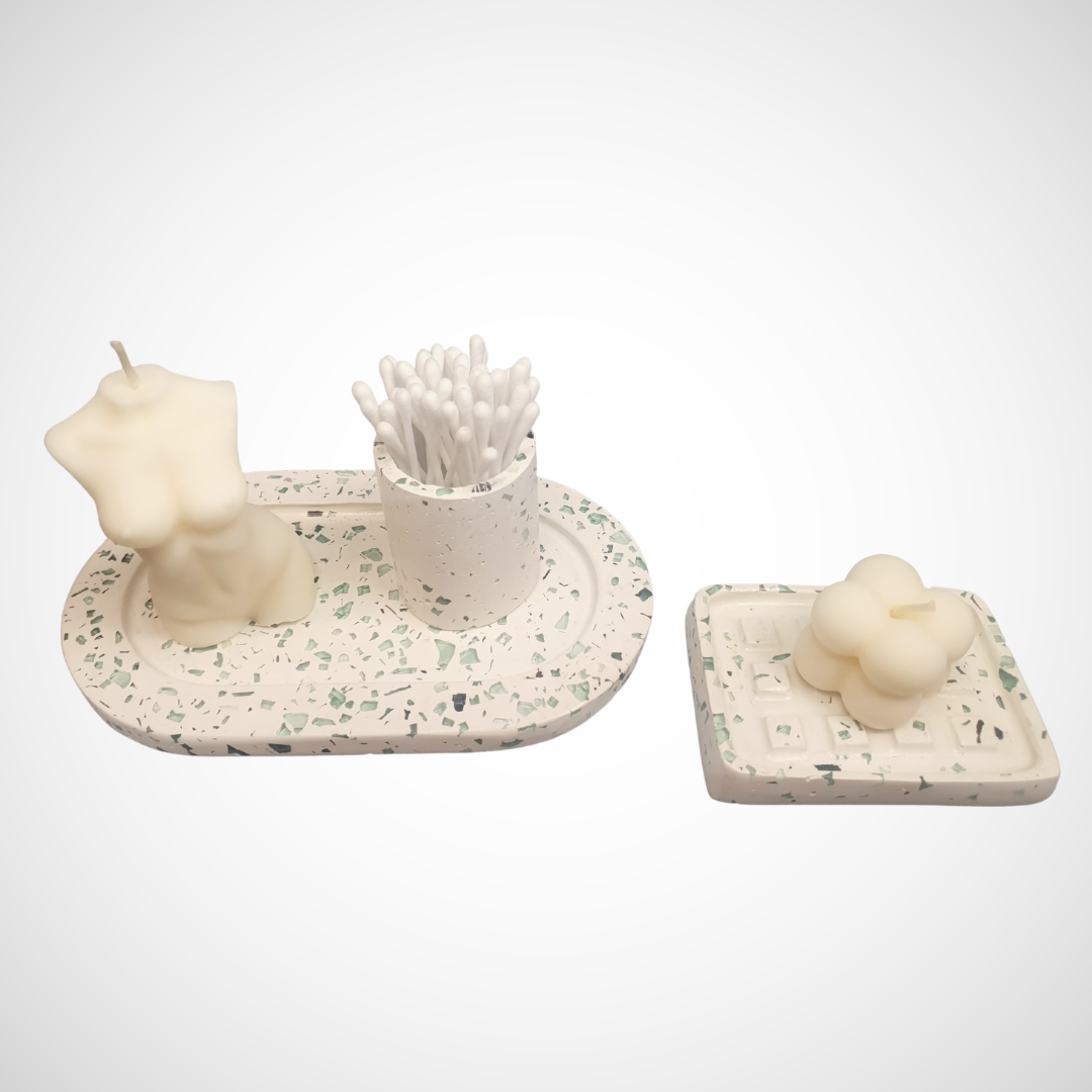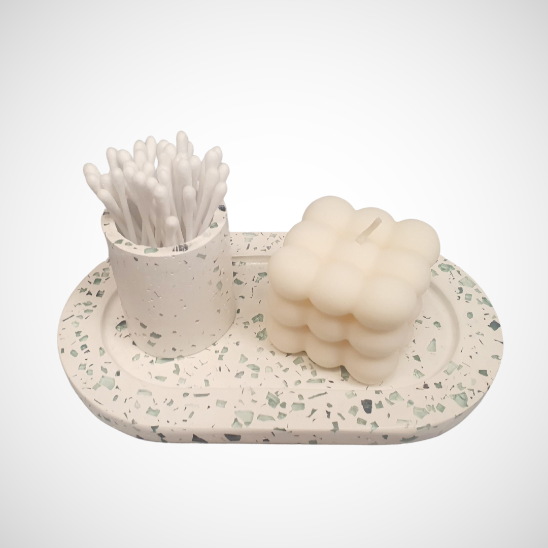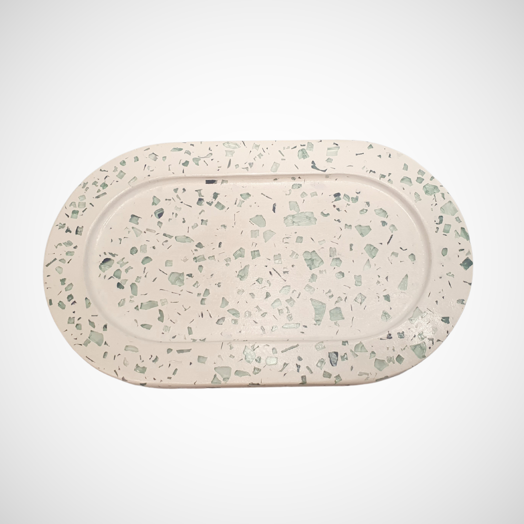 Divina, novedosa y versátil, esta Bandeja de Terrazo/cemento se puede usar desde el bar y servir aperitivos con amigos hasta el baño y lucirla con velas y perfumes.